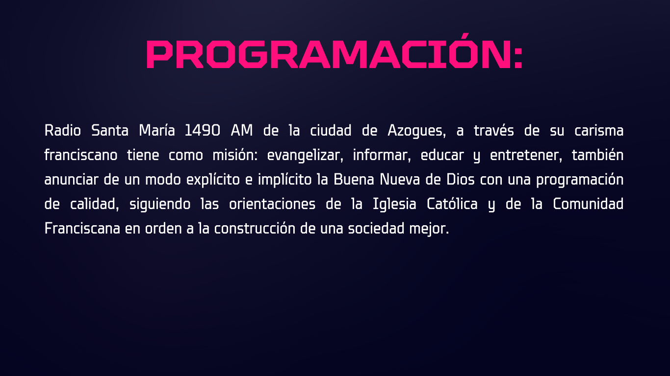 | Vamos contigo Francisco | Propio del medio | Programa conducido por la Tercera Orden Franciscana Seglar de Azogues | SÁBADO | 08H00 | 09H00 |
